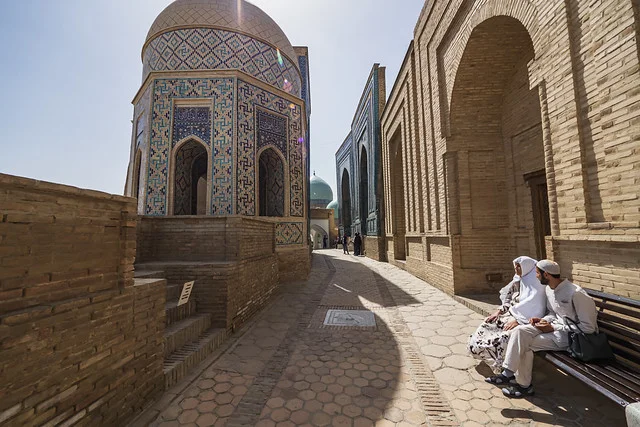 يقع مجمع شاه زيندا في قلب سمرقند بأوزبكستان، وهو موقع ديني يضم مجموعة من المقامات والمساجد التي تعود بدايات بنائه إلى القرن الحادي عشر واستغرق إنجازه ثماني سنوات. يُعتقد أن أقدس قبر فيه هو قبر قثم بن العباس، ابن عم النبي محمد، الذي يُنسب إليه نشر الإسلام في المنطقة. يتميز المجمع بزخارف السيراميك المزجّج (المجوليكة) الموضوعة بدقة بالغة، ما يجعله أحد أكثر المعالم تصويرًا في سمرقند.